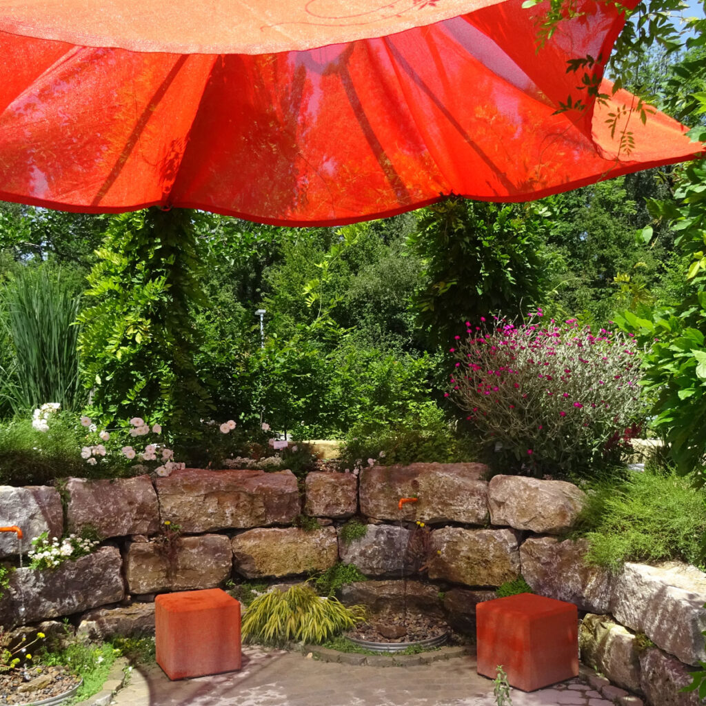 Natürlich kann kein Garten nur aus Steinen bestehen: Pflanzen, Wasser und Steine ergänzen sich und stärken sich gegenseitig in ihrer Wirkung. Pflanzen als Solitäre oder Formgehölze und Steine als Skulpturen, Amphoren, Brunnen… wetteifern als Blickpunkte im Garten. An der Terrasse und an allen wichtigen Punkten des Gartens bestimmen sie das Bild.